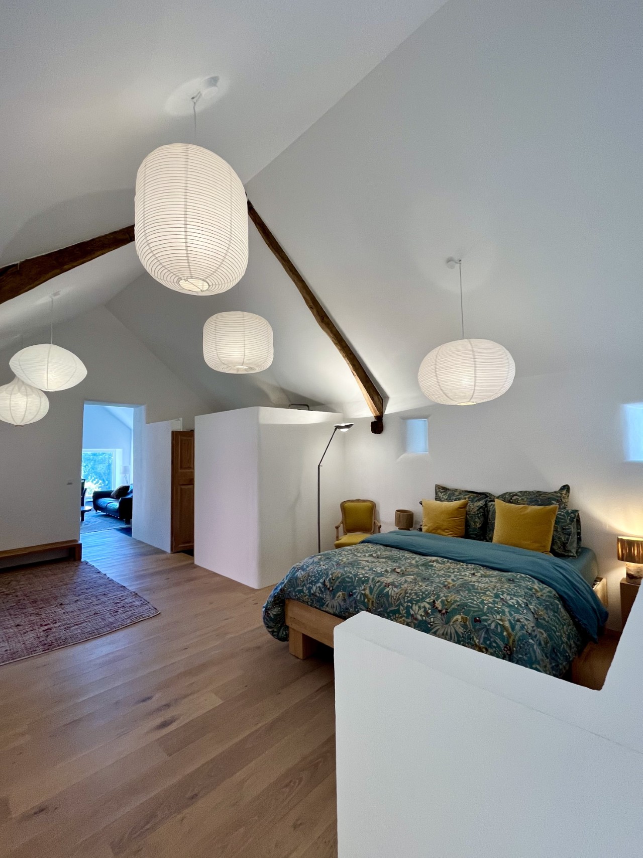Das Haus verfügt über zwei großzügige Schlafzimmer, ein Badezimmer sowie ein separates WC. Die Raumaufteilung ist offen gestaltet, ohne vollständige Abtrennung zwischen Schlafbereich und Erdgeschoss. Der kombinierte Wohn- und Küchenbereich lädt zu gemeinsamen Mahlzeiten und entspannten Abenden ein.
